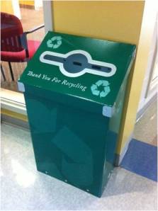 Each classroom has a recycling box (that’s a pic of my box) that the Environmental Team picks up to dump in the container in the parking lot.