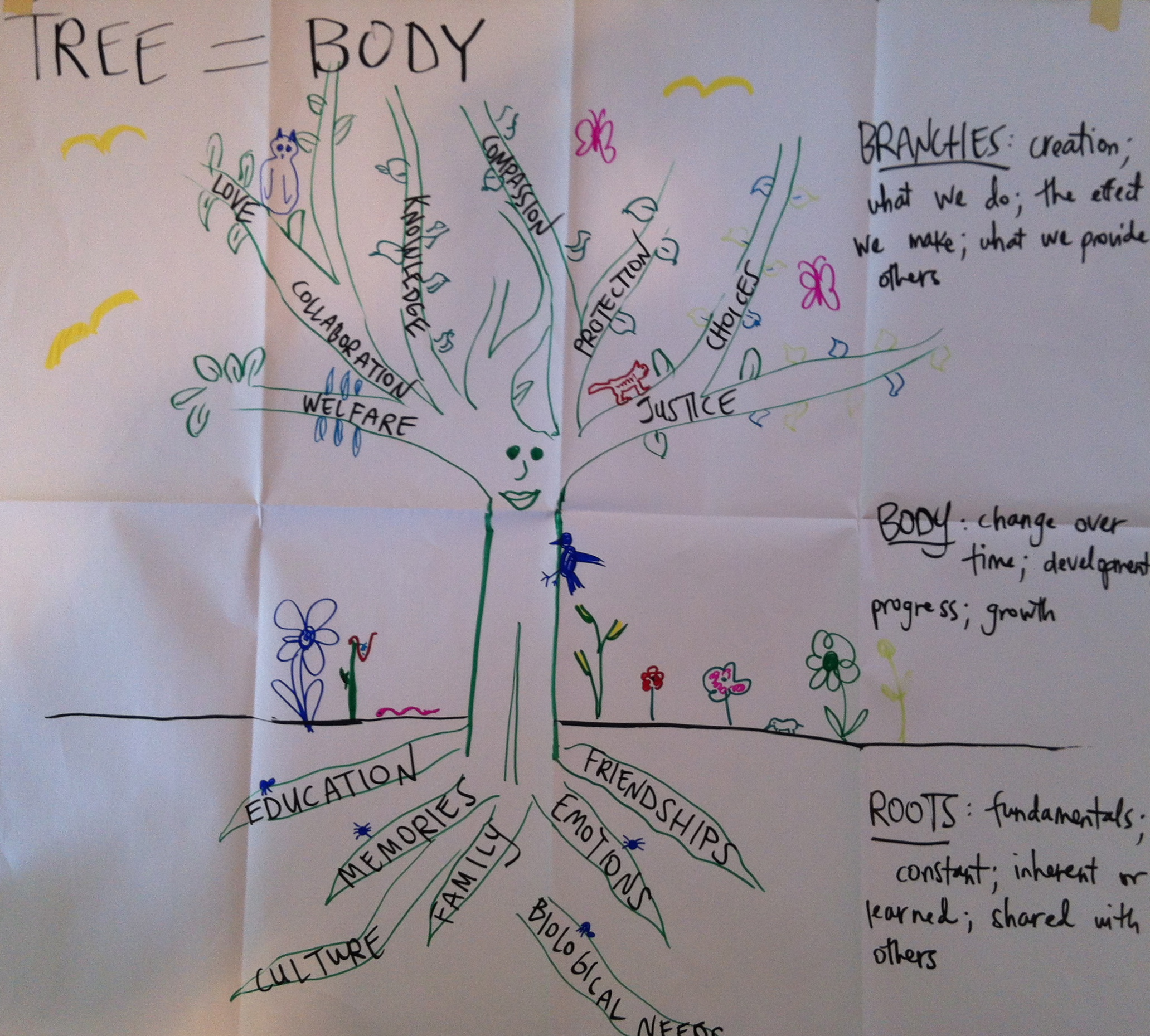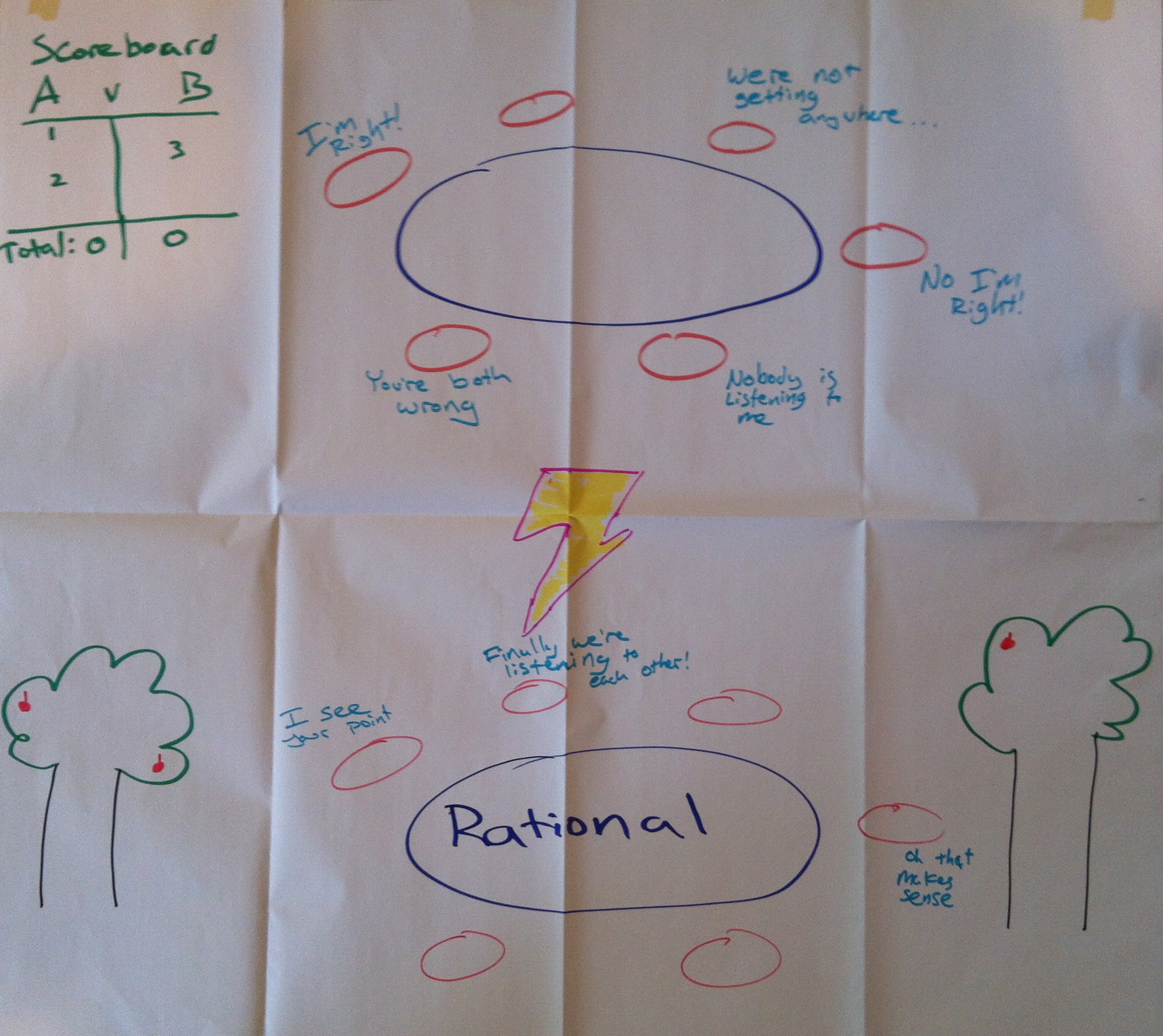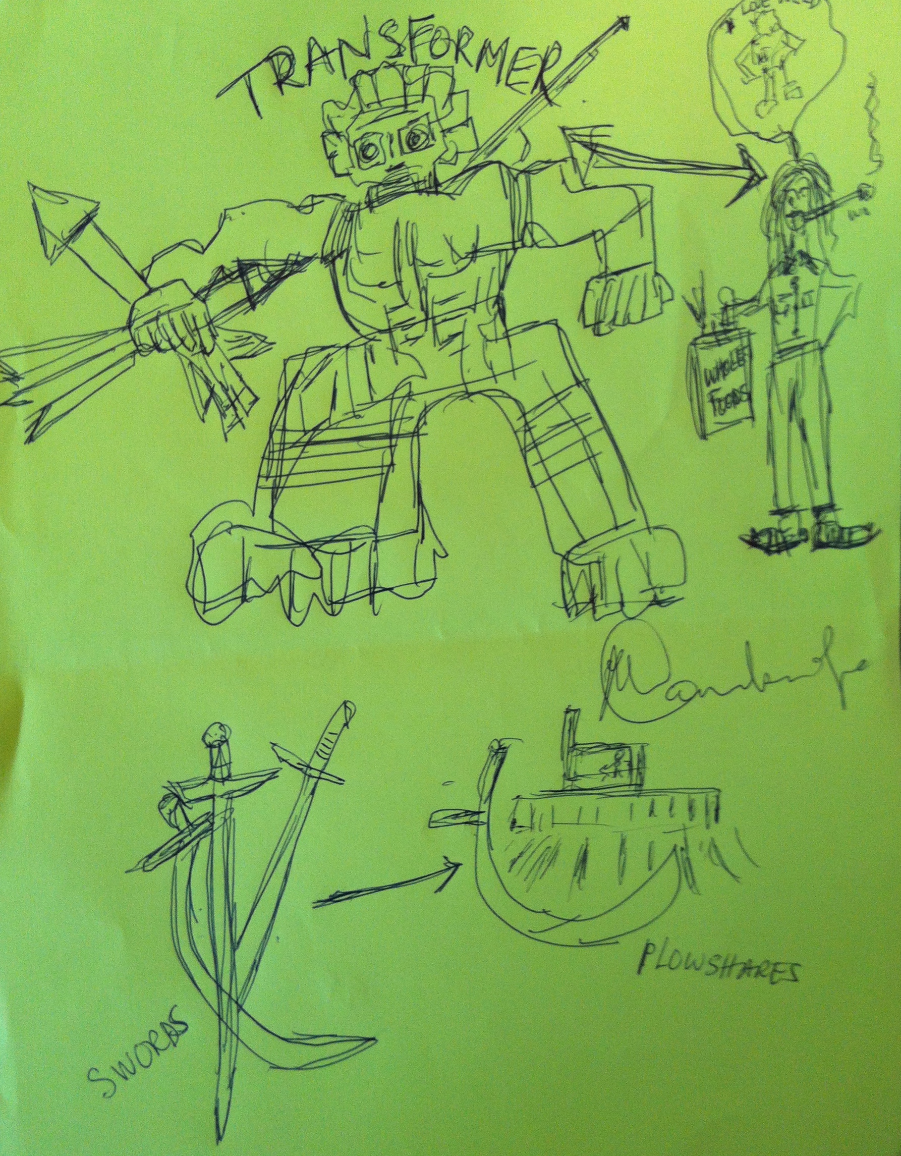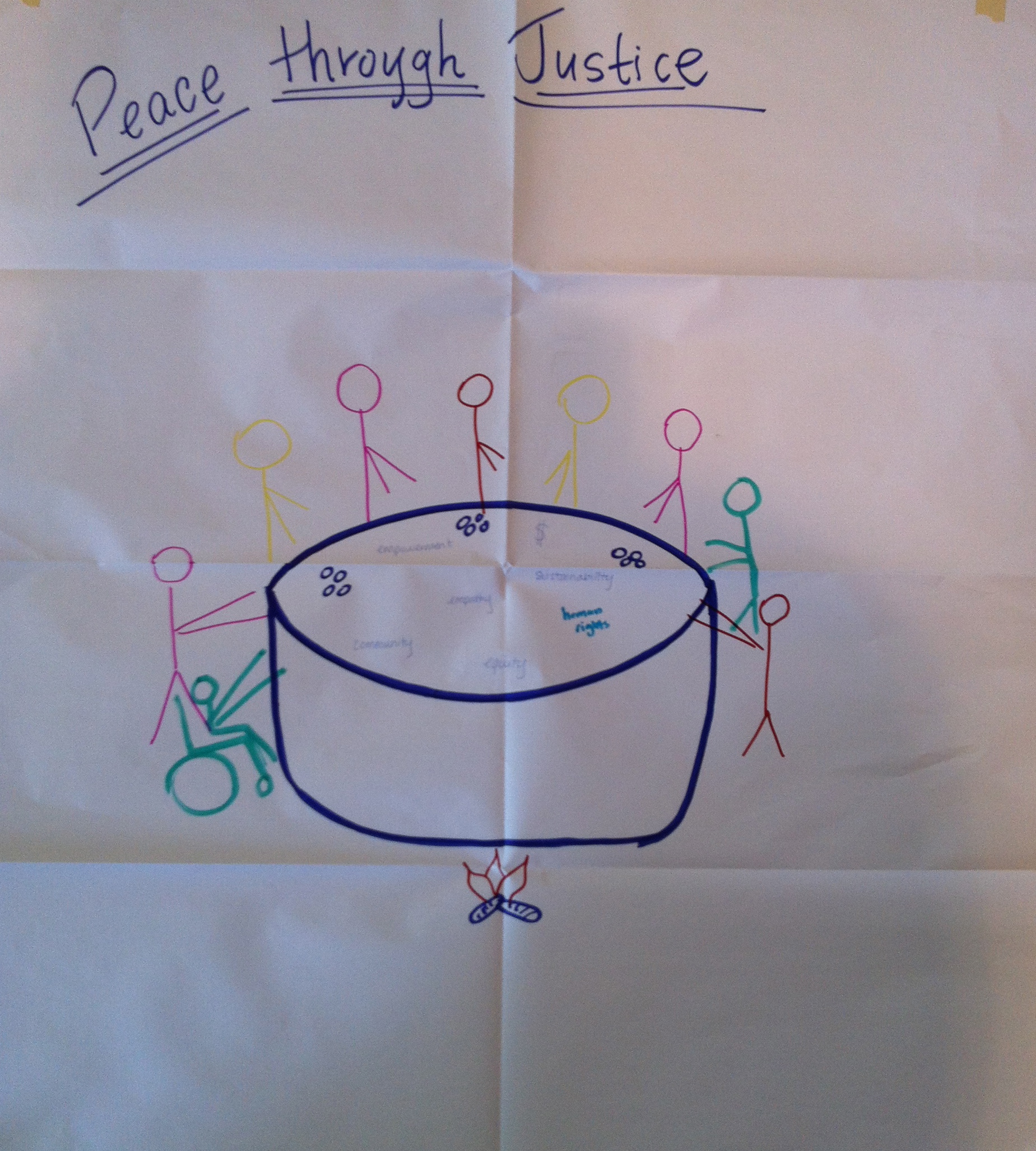 During our class on 09-19-12 we explored Ian Harris’ strategies for peace. The class broke up into groups based on which strategy for peace they felt most aligned with their worldview. Each groups was then tasked with creating a visual representation of that strategy. Here is what we created. The discussions of the artistic creations were quite enlightening.